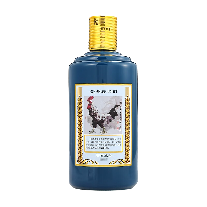 茅台生肖丁酉鸡,与“吉”谐音,孔雀蓝色“凤凰涅槃”,寓意功名好运、国泰民安